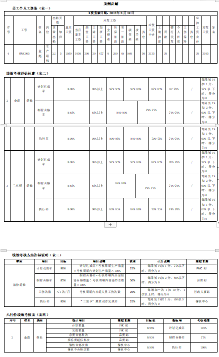 案例講解 我們拿“金彪”個人部分績效工資為例來計算 1.“金彪”上月工資條上的績效工資為980元(表一) 2.“金彪”績效考核(表四): ①計劃達成率:考核結果為101%,對應績效評估標準(表二)此項得100分。 ②制程合格率:考核結果為77%,對應績效評估標準(表二)此項得77分。 ③執行率:考核結果為100%,對應績效評估標準(表二)此項得100分。 3.“金彪”各項實際得分 ①計劃達成率:100分×權重40%(表三)=40分 ②制程合格率: 77分×權重30%(表三)=23.1分 ③執行率:100分×權重30%(表三)=30分 4.“金彪”的績效總分值=40+23.1+30=93.1分 5.“金彪”績效工資=980元×93.1%=912.38元 (八)績效考核工資的確定 1.變革前的做法和問題: 員工經過方案及案例的了解和學習后,以為公司只拿員工現有的工資進行考核,員工覺得公司推績效考核就是在降工資; 從以上案例計算來看,“金彪”上月工資條上的績效工資為980元,但實際績效工資只能拿到900元,如何讓員工在做出更好的業績的情況下,拿到更多的工資? 2.變革后的做法: